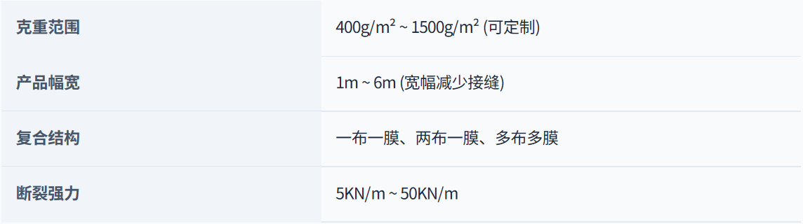 复合土工膜是以塑料薄膜作为防渗基材,与无纺布复合而成的土工防渗材料。金大禹采用先进的热复合工艺,将土工布的加筋防护性能与土工膜的优异防渗性能完美结合,具有强度高、延伸性能好、变形模量大、耐酸碱、抗腐蚀、耐老化、防渗性能好等特点。